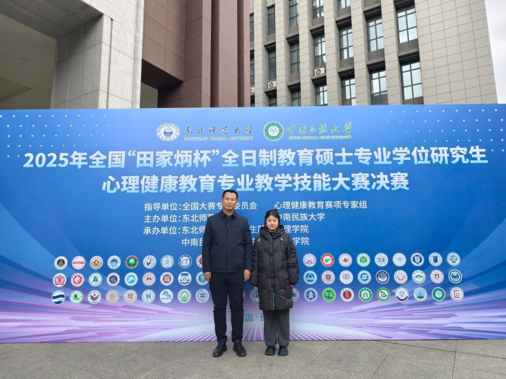 近日,2025年全国“田家炳杯”全日制教育硕士专业学位研究生心理健康教育专业教学技能大赛决赛在东北师范大学圆满落幕。经过激烈角逐,我院2024级心理健康教育专业硕士研究生应乐凭借扎实的专业基础和出色的现场表现,荣获全国二等奖,指导教师赵亮获评“优秀指导教师”。