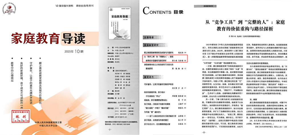近日,我院2023级教育学原理硕士研究生黄小冉完成的研究论文《从“竞争工具”到“完整的人”:家庭教育的价值重构与路径探析》一文被中国人民大学复印报刊资料《家庭教育导读》2025年第10期全文转载,原文发表于《继续教育研究》2025年第9期。宝鸡文理学院教育学院为该论文的独立通讯单位,黄小冉为论文第一作者,导师是马多秀教授,为论文第二作者。