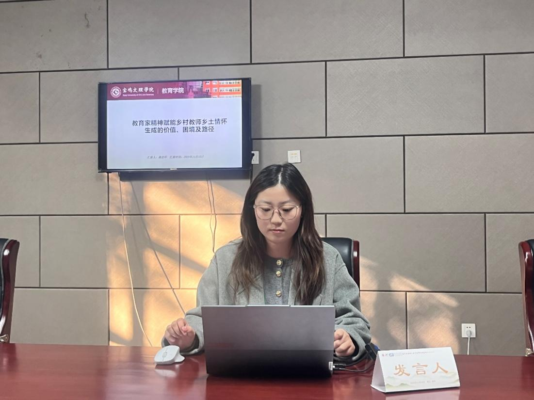 2024级教育学原理研究生姚忠环在第一分论坛上作了题为《教育家精神赋能乡村教师乡土情怀生成的价值、困境及路径》的报告。报告结合我国乡村专任教师发展现状,系统阐释了教育家精神与乡土情怀的内在契合性。针对当前乡村教师存在现实困境,她提出构建分层化精神传承体系、多主体协同培养机制与“三位一体”社会支撑体系的解决方案,为乡村教师扎根乡土、实现专业成长提供了实践路径。