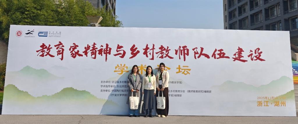 2025年11月15日,“教育家精神与乡村教师队伍建设”学术论坛在湖州师范学院东校区成功举办。本次论坛聚焦教育家精神传承与乡村教育发展核心议题,设置主会场主旨报告与五大分论坛平行研讨,来自华东师范大学、东北师范大学、浙江师范大学等高校的专家学者及一线教育工作者齐聚一堂,共话乡村教育振兴路径。我院张瑞霞老师带领研究生姚忠环、周佳欣参加此次学术盛会。